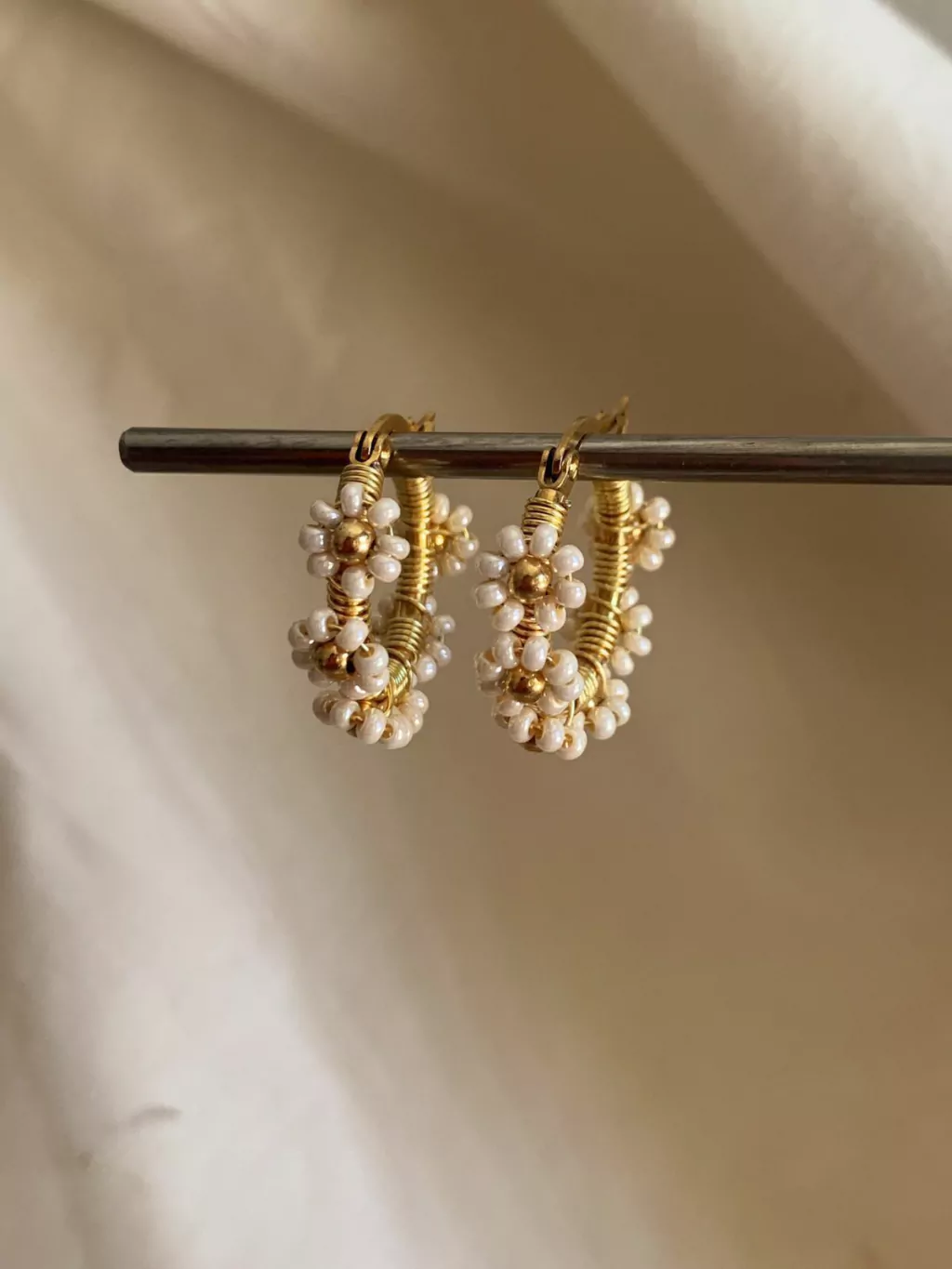 MATERIAL: argollas en acero inoxidable, moldeado a mano con alambre chapado en oro, perlas en mostacillas.